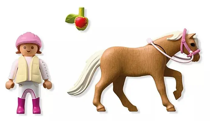 Set includes 1 girl with riding helmet and vest, 1 pony, 1 bridle, 1 apple.