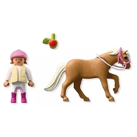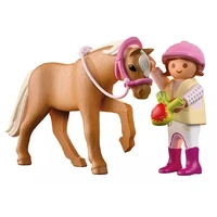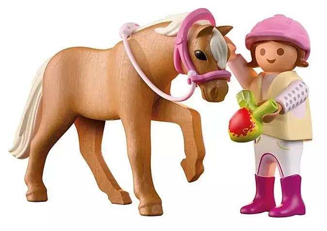 Off to the paddock! This sweet PLAYMOBIL DuoPack is perfect for little animal lovers. The girl, dressed in her riding vest and removable helmet, brings a juicy apple for her pony friend. The pony's bridle can be taken off, making grooming and feeding even more fun. With poseable parts and charming details, children can enjoy playful stable stories and caring moments. PLAYMOBIL DuoPacks are small but packed with imagination ideal for new adventures and expanding play worlds. Saddle up for heartwarming fun with this delightful PLAYMOBIL pair!