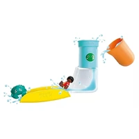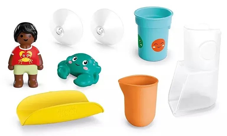 An action-packed bath day awaits! The little boy and his mischievous crab friend zoom down the slide. They get an extra boost with water from the tank. Once your child gets the hang of it, they won't want to leave the bathtub! The slide and the waterfall tank are quickly attached to the edge of the bathtub with suction cups, and the fun can begin. Who will turn the cup in the waterfall tank to the red face and fill the tank with water? Who's brave enough to turn the cup to the green face and release the waterfall? Who will be the first to zoom down the slide with a rush of water? This game is endless fun: turn, pour, turn, and start all over again!