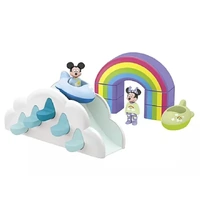 Set includes 1 Mickey Mouse, 1 Minnie Mouse, 1 cloud house with sun door, 1 rainbow with rattle function, 4 rainbow stones to stack and puzzle, 5 raindrop puzzle pieces, 2 dream planes.