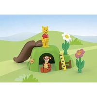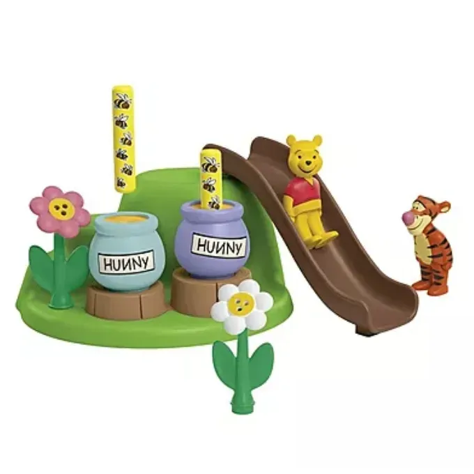 Set includes 1 Winnie the Pooh, 1 Tigger, 1 bee garden with cave and honey pots, 1 slide, 2 bee sticks, 2 plug-in flowers.