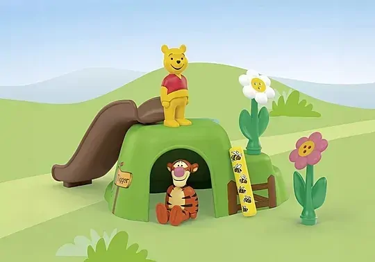 Disney's Winnie the Pooh and Tigger spent a delightful day in the Honey Garden! This toy set inspired by Disney promises endless fun and excitement. As Winnie and Tigger frolic in the garden, they indulge in sweet honey, pick colourful flowers, and joyfully zoom down the slide. What do you think they enjoy most? In Winnie the Pooh's and Tigger's Honey Garden, your child can explore a multitude of activities and carefully place the lovingly designed accessories in their rightful spots: Where do the bee poles belong, and where do the flowers go? Press a bee pole into the honey pot, and watch it bounce back out with glee. Who can make the pole jump higher? Wait, what's this? Are the flowers stuck in the honey? Your child can send Tigger and Winnie sliding down the slide. Who zooms faster into the Honey Garden? After an eventful day in the Honey Garden, the two friends can relax in Tigger's home. Encourage your child to weave exciting tales about Tigger and Winnie the Pooh!