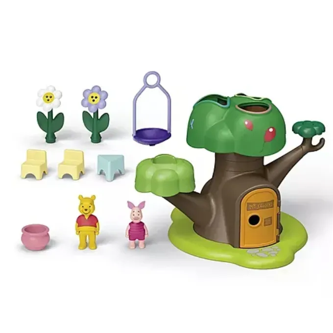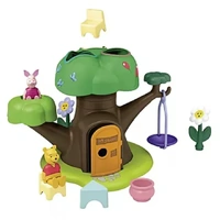 Set includes 1 Winnie the Pooh, 1 Piglet, 1 tree house with door and sorting function, 1 swing, 1 treetop spinner, 2 plug-in flowers, 2 chairs, 1 table, 1 honey pot.