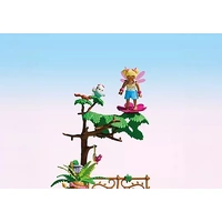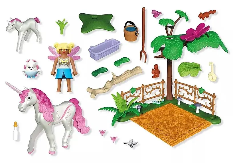 Set includes 1 woman, 1 joyling, 1 unicorn, 1 unicorn foal, 1 butterfly, 1 bird, 2 squirrels, 1 base plate, 2 fences, 1 tree, 1 giant flower, 1 plant, 1 flower box, 1 branch, 1 spit, 1 water bucket, 1 milk bottle, 3 mushrooms, 2 hair bows, 1 wing collar, 2 wings, 2 bracelets, 1 corsage flower, 1 small pair of wings.