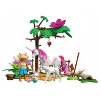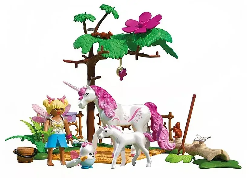 In a dreamy forest clearing, a hidden haven awaits home to a gentle unicorn and her playful foal. Under a leafy canopy, magical moments unfold as the fairy and her joyful companion care for their mystical friends. A bottle of milk, a splash of water, and plenty of cuddles bring the scene to life. With charming animals, enchanted accessories, and delightful details like a corsage flower, this PLAYMOBIL playset invites kids into a world of fantasy and friendship. Let imaginations gallop free with the wonders of PLAYMOBILs Magical Unicorn Stable!