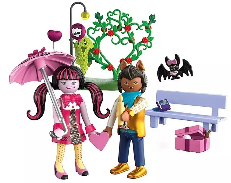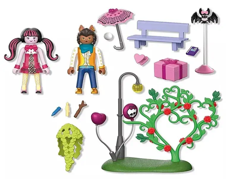 Set includes 1 Female Teen Figure (Draculaura) 1 Male Teen Figure (Clawd Wolf), Bat (Draculauras pet), Park Bench, Umbrella, Heart-Shaped Holder (connects the figures), Street Light, Heart-Shaped Balloons, Heart-Shaped Plant Decoration, Gift Box with Small Accessories.