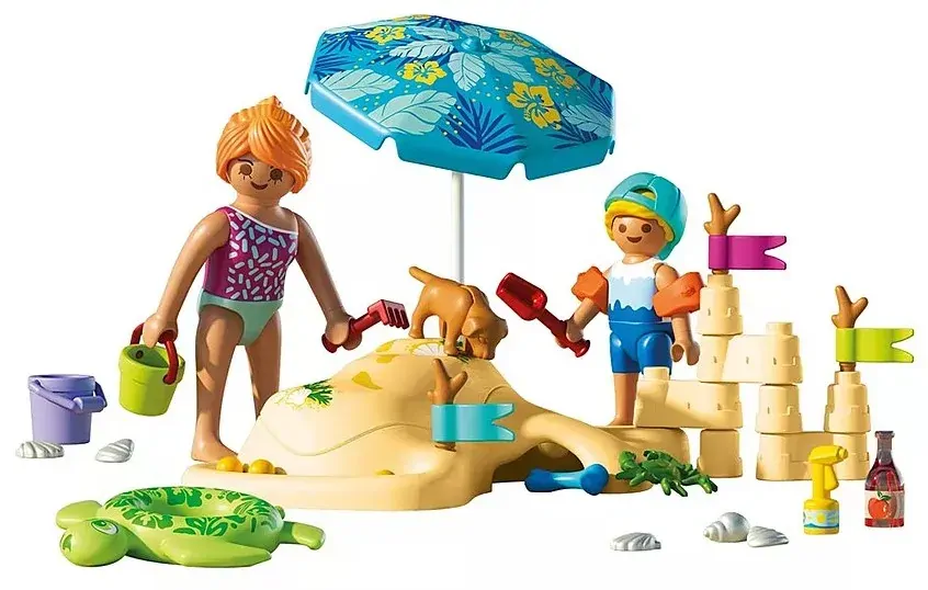 Its beach day with PLAYMOBIL! Kids can build their dream sandcastle using the customizable elements, race marbles down the mini watercourse, and even bury a figure in the sand with the removable lid. Flags and the parasol can be placed around the beach for ever-changing play. The set includes a playful dog, a curious crab, and lots of beach accessories from shells and buckets to a swimming ring and sun cream. With so many fun details, this colourful PLAYMOBIL playset is perfect for sunny, imaginative adventures full of creativity, laughter, and seaside surprises.