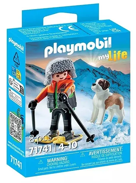 Brave the snowy wilderness with the PLAYMOBIL Hiker and his loyal Saint Bernard! Equipped with snowshoes and poles, the adventurer is ready to explore icy trails, while the Saint Bernard faithfully tags along, its head poseable for lifelike play. Kids will love customizing the hiker by removing his headgear and snowshoes for even more storytelling fun.