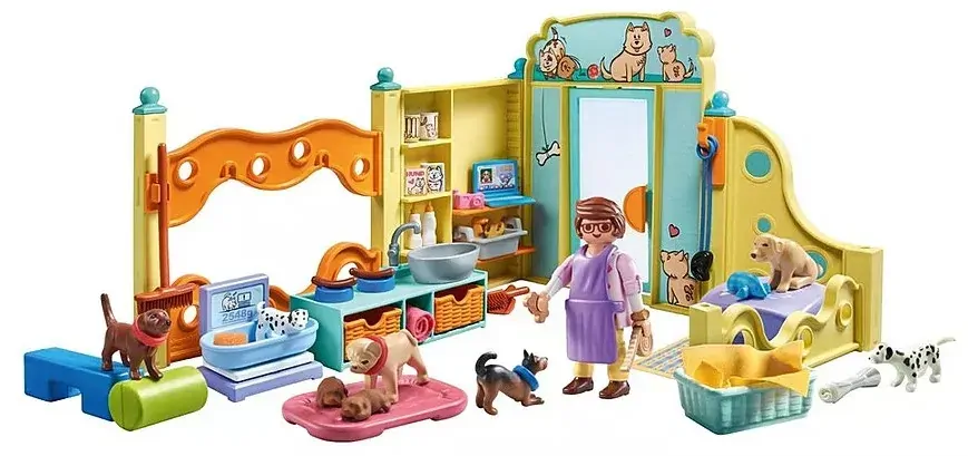 Maintain happy pups by washing, trimming, and pampering them with cozy towels. The Puppy Care Centers sink and grooming tools make the process fun, teaching kids responsibility and gentleness. With soap, brushes, and sponges on hand, each puppy emerges clean and content. Regular checkups on the scale also help track progress, encouraging a caring approach to health. Create spa moments in this welcoming puppy haven. Unleash endless excitement by pairing the PLAYMOBIL puppy house with the Animal Hotel for a canine paradise. More pups, additional accessories, and extra space mean greater opportunities for creativity and interactive storytelling. Arrange dog runs, feeding corners, and cozy rest spots, so puppies mingle freely. With countless setups and accessories, kids remain engaged, fostering nurturing habits. Every moment becomes an adventure in this puppy-filled universe.