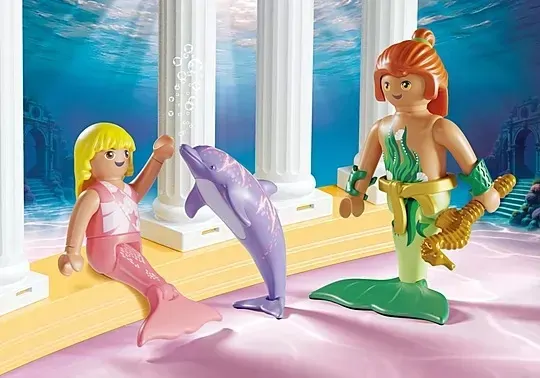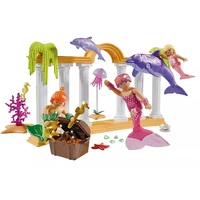 Set includes 1 mermaid, 1 merman, 1 mermaid child, 1 dolphin, 1 dolphin pup, 1 jellyfish, 1 seahorse, 4 shells, 1 starfish, 1 shell half with suction cup, 1 arcade pillar with 2 water plants, 1 treasure chest, 1 water plant, 1 transparent rod with stand, 1 crown, 1 finger ring with starfish, gold coins, jewels, 4 arm cuffs, 1 hair ring, 1 silicone hair elastic, 1 hair ornament, 1 hair stud.