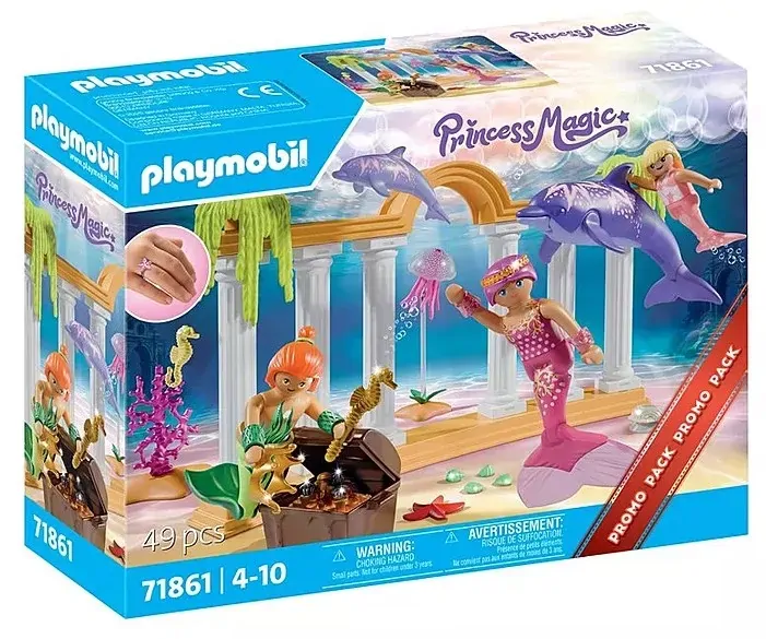 Sparkling secrets lie beneath the waves! With shimmering fins and flowing hair, the PLAYMOBIL mermaid family explores a hidden world of coral pillars, glittering treasures, and friendly sea creatures. Dolphins leap playfully while a jellyfish and seahorse glide by. The treasure chest overflows with gold, gems, and magical accessories including a real finger ring! This enchanting PLAYMOBIL set is filled with fun details like a shell with suction cup and underwater plants for imaginative play under the sea. Dive into fantasy and let the underwater adventure begin!