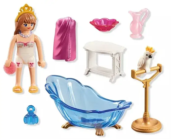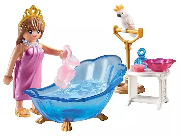 Delight in a serene royal bath as the princess luxuriates in her elegant bathtub filled with real water. Every detail of the PLAYMOBIL Royal Bathtub set, from the sparkling water to the soft towel, creates an atmosphere of refined relaxation. The graceful cockatoo adds charm, while the detailed accessories enhance the experience and encourage creative play.