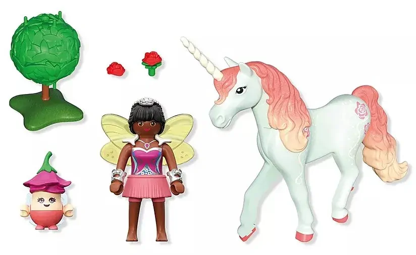 In the magical skies above the Unicorn Kingdom, Sky Rose glides with elegance and charm. Her fairy companion and the Joyling are always by her side, ready to share in dreamy adventures among blooming roses and floating clouds. With delicate wings, sparkling accessories, and a lovely rose tree, this PLAYMOBIL playset invites endless creative fun. Children can mix and match Sky Roses mane, tail, and horn with other unicorns from the new PLAYMOBIL Unicorn series to craft their very own magical herd. A must-have for unicorn collectors and little storytellers alike!