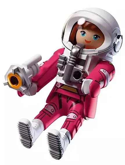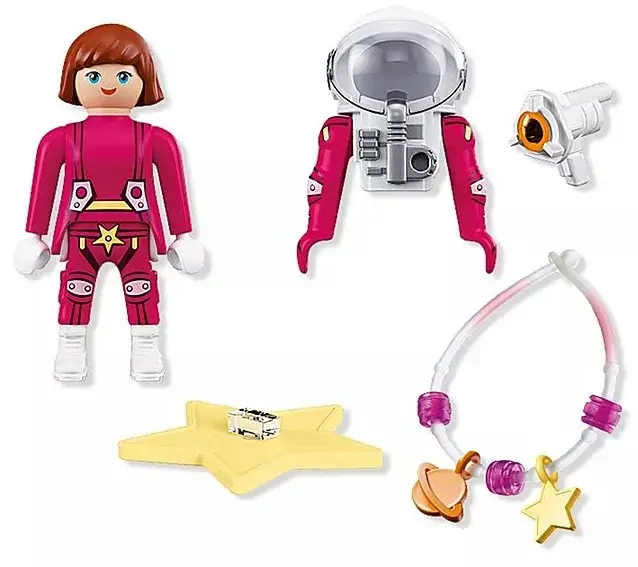 Set includes 1 Female Astronaut, 1 Astronaut Helmet, 2 Arm Bracers, 1 Laser Pistol, 1 Silicone Bracelet, 3 Beads, 2 Charms, 1 Star-Shaped Base Plate.