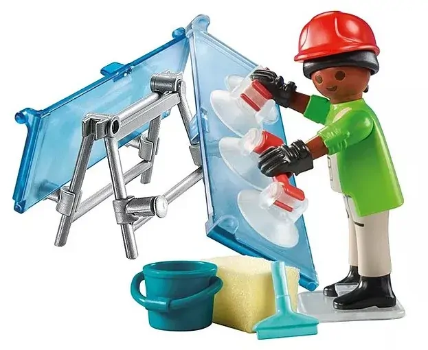 Brighten up any scene with the PLAYMOBIL Glazier set! Using the suction cup handles, the Glazier can securely hold the glass panes for realistic play. Whether installing a new window or giving it a crystal-clear shine with the included bucket, sponge, and squeegee, the glazier brings precision and sparkle to every project.