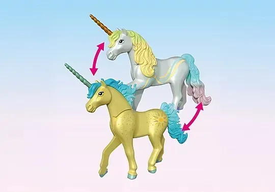 Meet the unicorn Sunshine Blossom and her enchanting fairy friend! Sunshine Blossom is loved by the fairies for her cheerful spirit, brightening every day with her sunny nature. Her unwavering confidence makes even the most challenging tasks feel easy to achieve. The enchanting fairy is accompanied by her adorable sidekick, the Joyling, who helps care for the unicorn with great joy and dedication. The unicorns mane, tail, and horn are interchangeable, allowing you to create unique and personalized unicorn designs when combined with other unicorns from the new PLAYMOBIL Unicorn series!