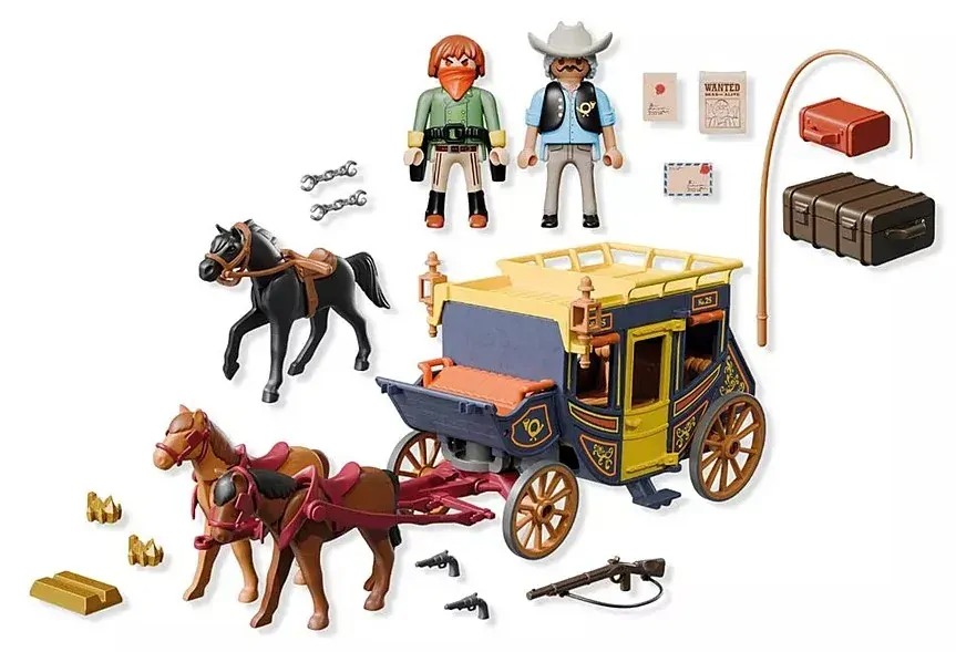 Adventure awaits on the dusty trails! The PLAYMOBIL Stagecoach thunders through the Wild West with two brave figures and three sturdy horses. With space for two up front and four inside, theres room for everyoneeven bandits! A removable roof reveals the detailed interior, and the horses can be ridden to the action. Packed with gold, letters, and luggage (plus a wanted poster!), this set is perfect for thrilling chases and daring escapes. Includes a stagecoach, handcuffs, weapons, gold, and lots of Wild West accessories for exciting roleplay in the PLAYMOBIL world.