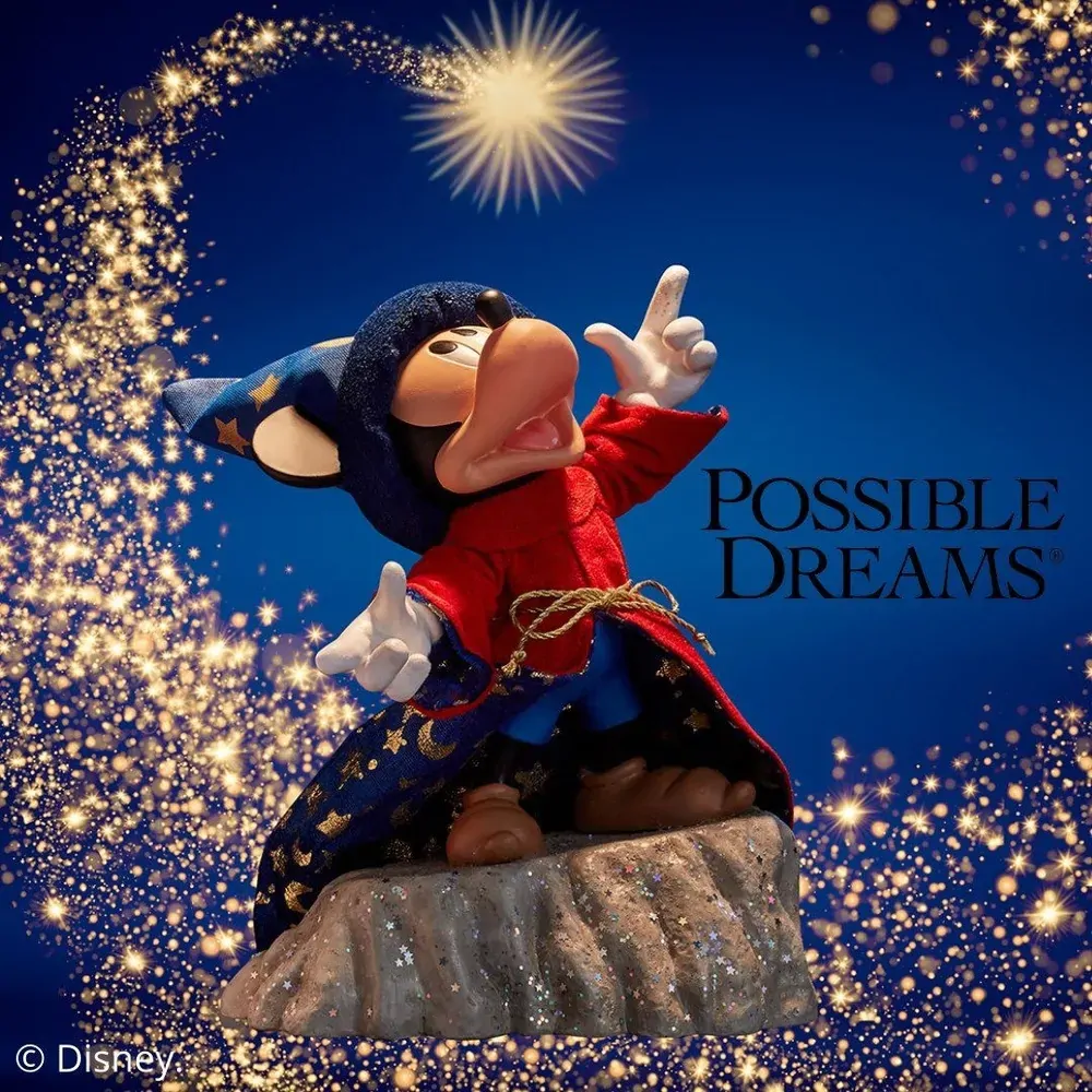 This Possible Dreams Sorcerer commemorates the 80th Anniversary of the movie, Fantasia. Dressed in a Clothtique robe with metallic printed velour, Mickey comes to life on the rocky ledge.