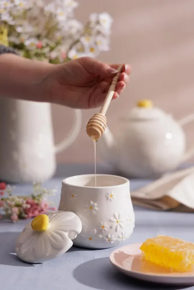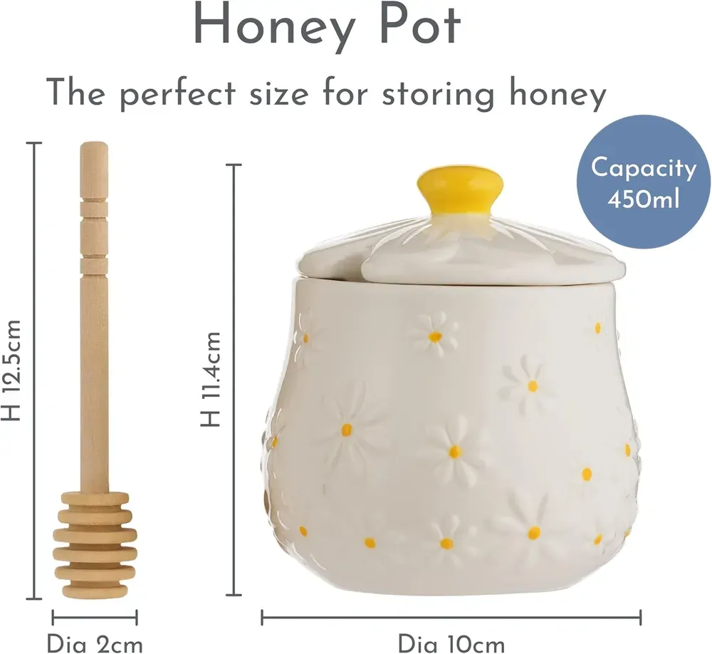 The Price & Kensington Daisy honey pot & drizzler is crafted from high-quality ceramic and includes a Betula wooden drizzler. Perfect for serving honey, the honey pot features a novelty embossed daisy 3D lid and is finished with a radiant yellow hand paint handle. Featuring a pretty petal embossment with a soft cream glaze and delicate yellow hand paint centre across the body of the bowl, the honey pot & drizzler is the perfect playful addition to any kitchen decor. The Daisy honey pot & drizzler is part of a fully co-ordinating collection, including ceramic storage and tabletop accessories.