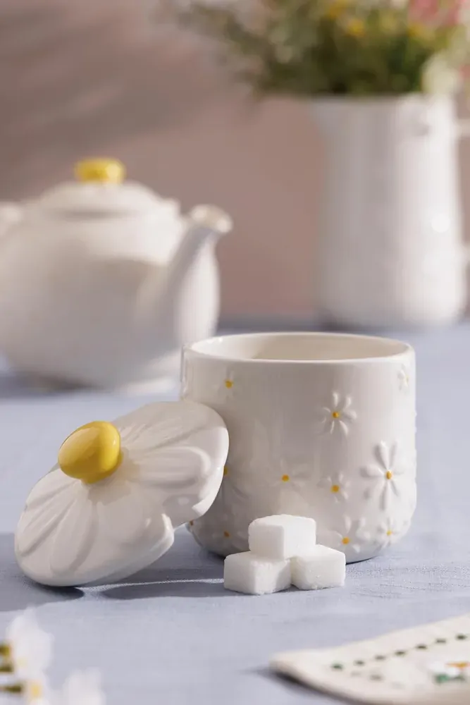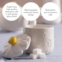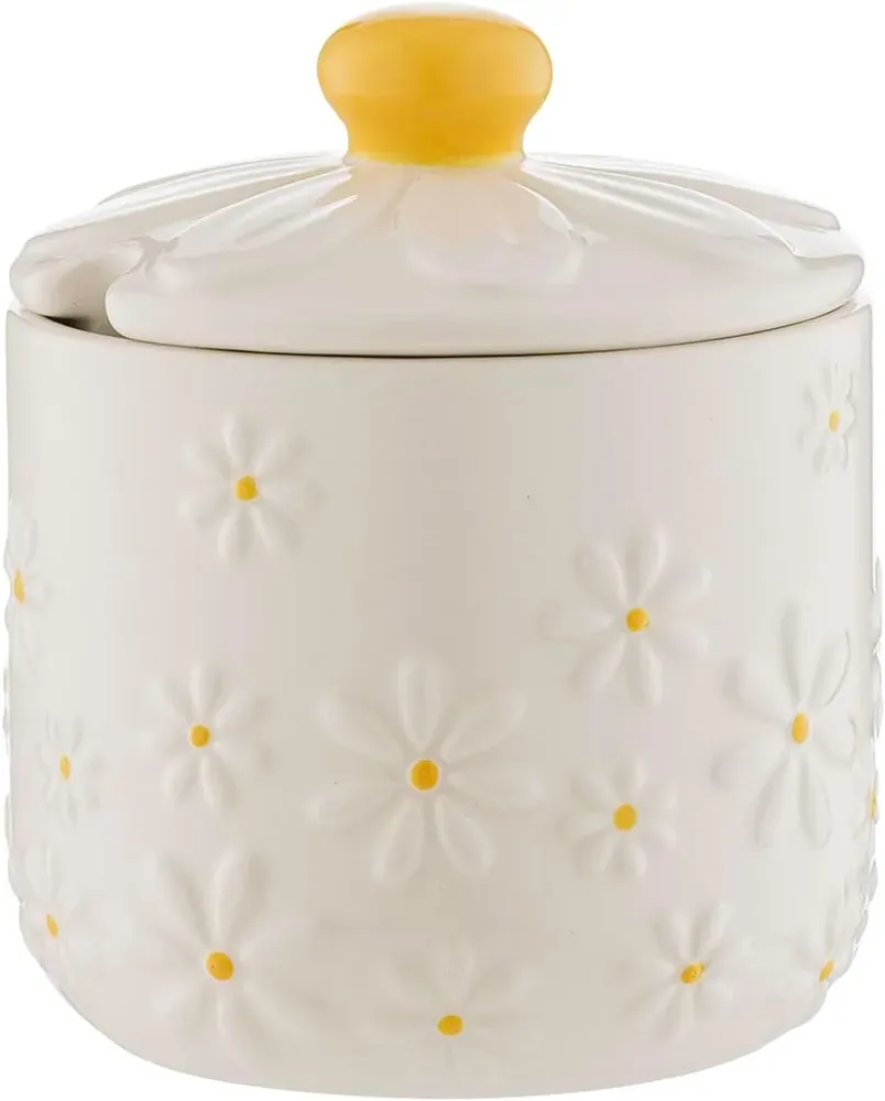 The Price & Kensington Daisy Sugar Bowl adds a playful floral touch to your kitchen, featuring a novelty embossed daisy 3D lid with a hand-painted yellow handle and a soft cream glaze. Made from high-quality ceramic, this sugar bowl boasts a delicate yellow hand-painted centre and petal embossments. Perfect for everyday use and storing sugar or sweeteners. Ideal for storing sugar or sweeteners, this decorative bowl also enhances your kitchen décor with its whimsical and elegant touch.