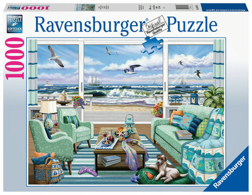 Picture yourself relaxing on a comfy sofa, watching the gentle waves rolls in to the beach through the open sliding doors depicted in this serene scene. This jigsaw's cool blue and minty green colour palette add to the sense of peaceful calm and provides a picturesque image for you to assemble. The rhythmic process of puzzling and Ravensburger's premium quality materials make for the perfect way to unwind while boosting your cognitive skills.