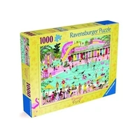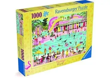 Dive into a vibrant oasis of fun and relaxation with this captivating 1000-piece puzzle. This lively puzzle transports you to a bustling scene where swimming pools sparkle under the sun. In the pools, people of all ages enjoy swimming and splashing around, while attentive lifeguards keep watch from their posts. Alongside the pools, colourful water slides add an extra dash of excitement. At poolside tables, families and friends gather, sipping refreshing drinks and soaking in the lively atmosphere.