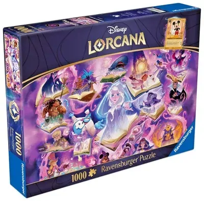 This 1000 piece puzzle is based on the popular Disney Lorcana card game, depicting beloved characters from Wizard's Apprentice Arthur and Hunny Wizard Pooh to Accomplished Mystic Belle and Supportive Friend Genie.