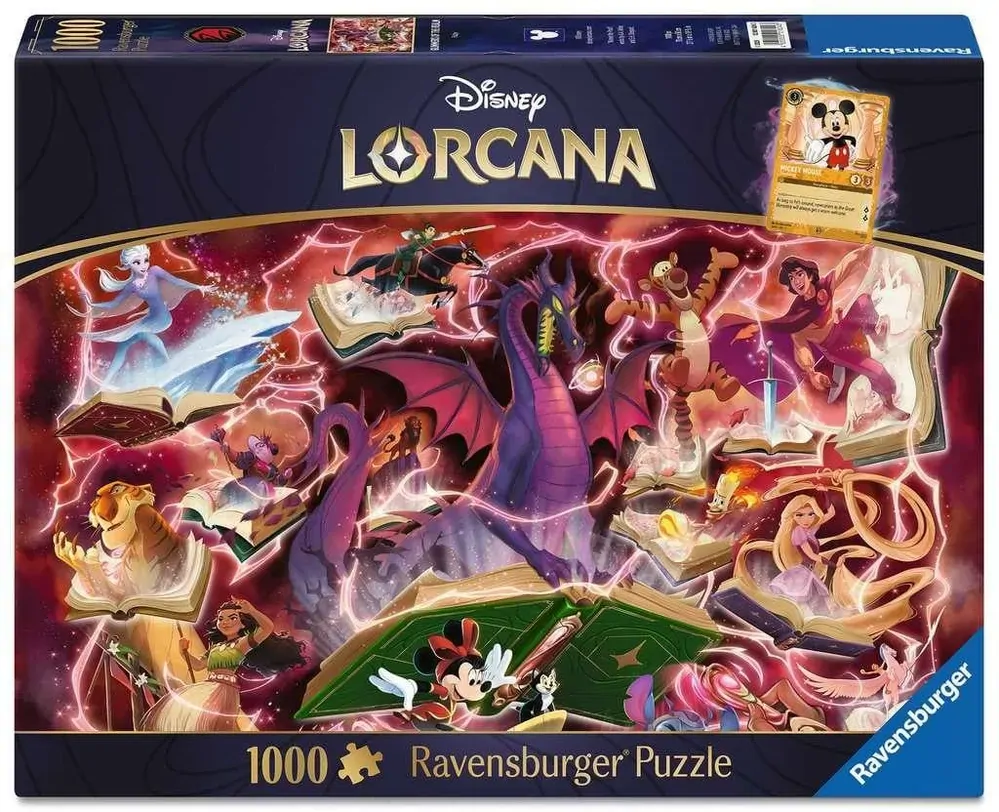 This 1000 piece puzzle is based on the popular Disney Lorcana card game, depicting beloved characters from Ice Surfer Elsa and Imperial Soldier Mulan to Heroic Outlaw Aladdin and Hotheaded Candelabra Lumiere.