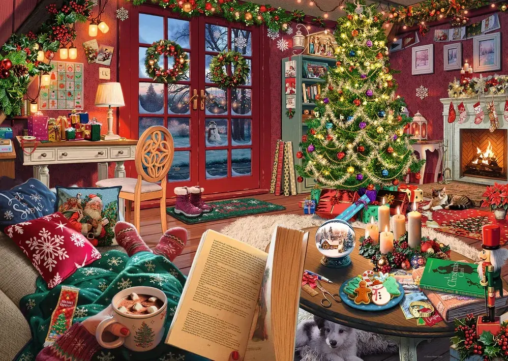 The fourteenth instalment in Ravensburger's My Haven series, this festive puzzle depicts the cozy interior of a cabin all lit up and decorated for the holiday season. The tree is hung with tinsel and brightly-coloured baubles, a snowglobe sits on the cofeee table, and a cat warms themself up by the fireplace as the resident relaxes with a mug of hot cocoa and a book.