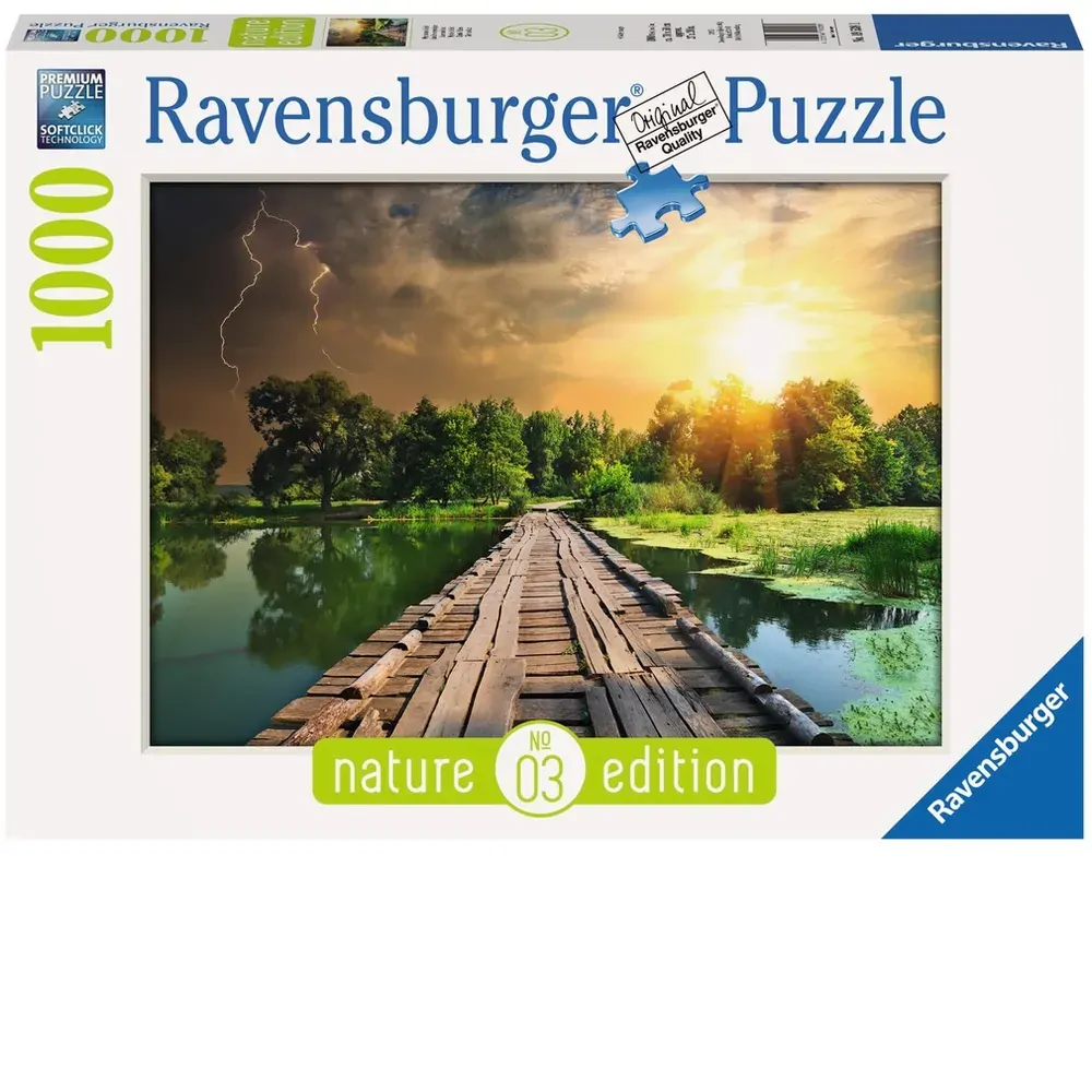 You'll be immersing yourself in the captivating beauty of nature as you methodically piece together the scene depicted in this jigsaw: a serene lakeside oasis, where a weathered wooden bridge spans calm waters as lightning crackles dramatically in the distance while the sun defiantly shines down. This puzzle boasts a crystal clear and glare-free image due to it's fine linen paper finish, plus extra durability with it's thick cardboard construction.