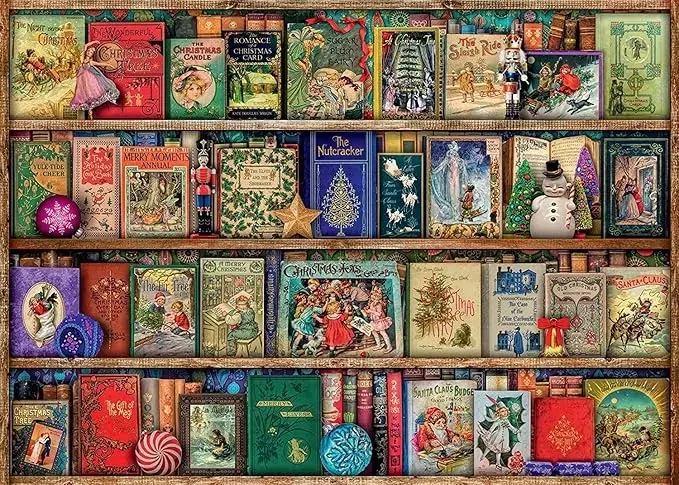 The Christmas Library puzzle features colourful shelves stacked with vintage Christmas favourites, showcasing nostalgic and seasonal volumes such as The Gift of the Magi, The Nutcracker, and The Sleigh Ride. Some covers like The Case of the Blue Carbuncle add an intriguing puzzle challenge with their hidden festive connections. This original and delightful design brings festive cheer and fun puzzle challenge nights to your home.