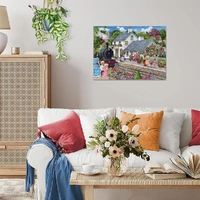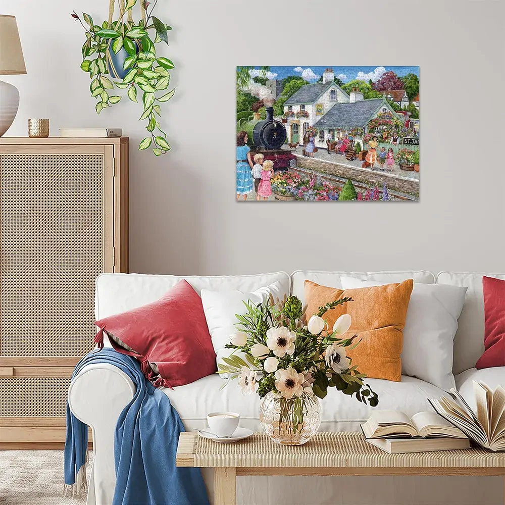 A charming countryside jigsaw puzzle from Ravensburger. Debbie Cooks artwork shows a quaint station cottage, vibrant flowers, waiting travellers, and a nostalgic steam train.