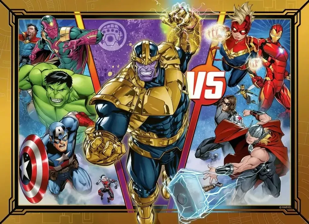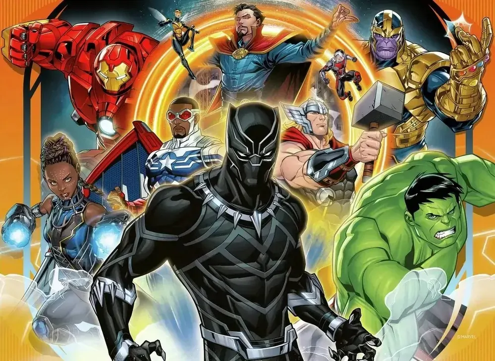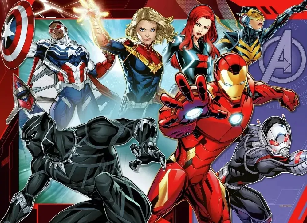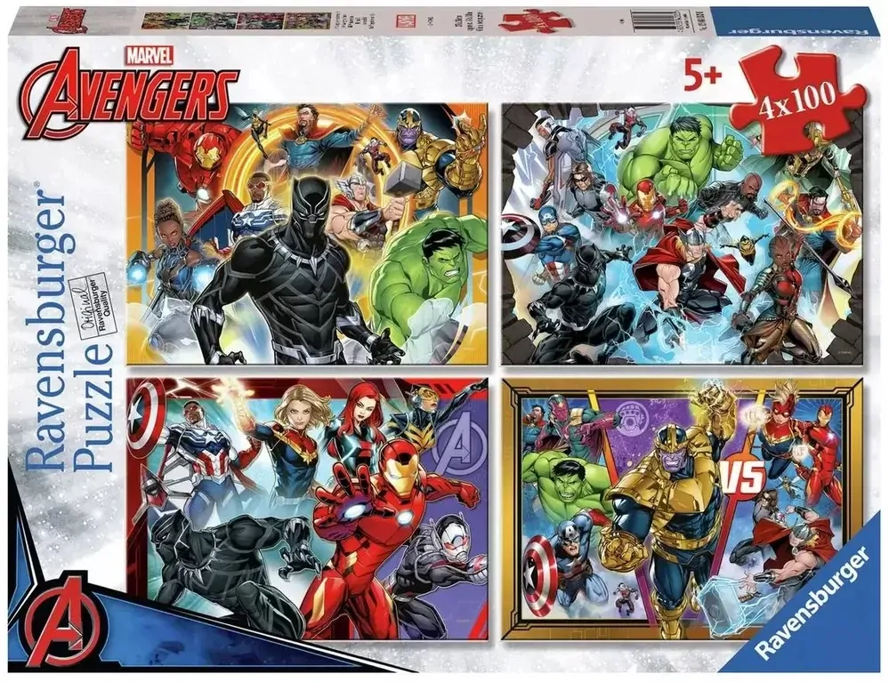 This Ravensburger Disney Marvel Avengers Bumper Pack features four exciting 100-piece puzzles, each showcasing iconic Marvel Avengers characters such as Hulk, Iron-Man, Captain Marvel, Thor, Captain America, Black Widow, and Black Panther.