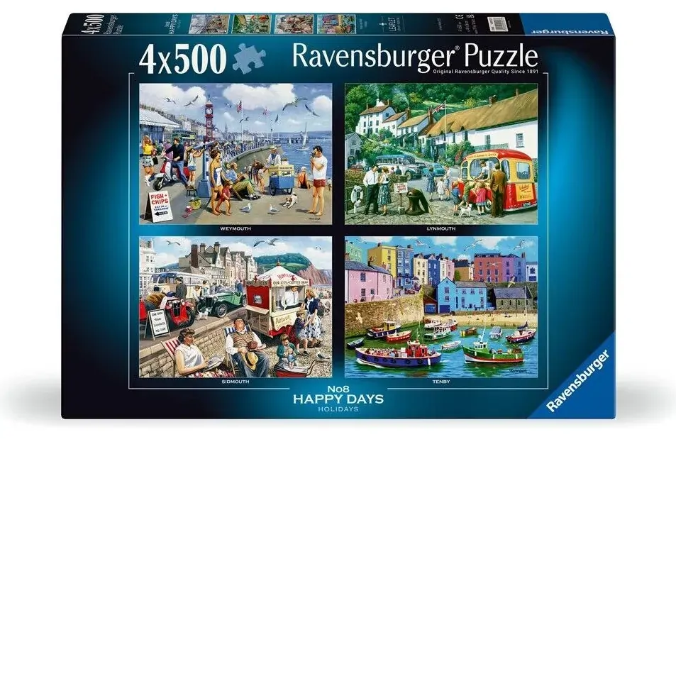 Ravensburger - Happy Days No.8 Holidays 4x500p is a captivating puzzle set that brings the joy of holiday scenes to life. With four unique 500-piece puzzles included, this collection offers hours of entertainment for puzzle enthusiasts and families alike. Each puzzle showcases vibrant images that evoke nostalgia and happiness, making it perfect for relaxing evenings at home or enjoyable gatherings with friends. Designed with Ravensburger's commitment to quality, these puzzles are made from durable materials and feature an anti-glare finish, ensuring a pleasant puzzling experience.