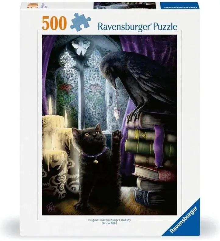 Get a little spooky with this intricately detailed puzzle from Ravensburger, depicting a gothic scene of a black cat reaching for an equally charcoal-shaded raven, surrounded by stained glass, ancient books and dripping candles.