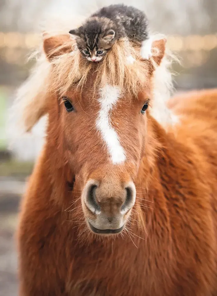 Revel in the playful antics of a tiny feline as it takes a ride on the head of its equine companion, its white nose stripe stripe a beacon of pure delight. This puzzle is a testament to Ravensburger's commitment to quality and craftsmanship, ensuring a satisfying and engaging puzzle-solving experience.