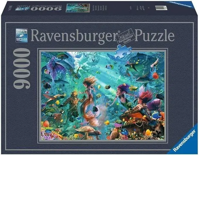 Explore the depths with Ravensburger's Kingdom Underwater puzzle, featuring 9000 pieces of vibrant mermaids, divers, and sea life. Discover hidden treasures and immerse yourself in this colourful and detailed underwater world.