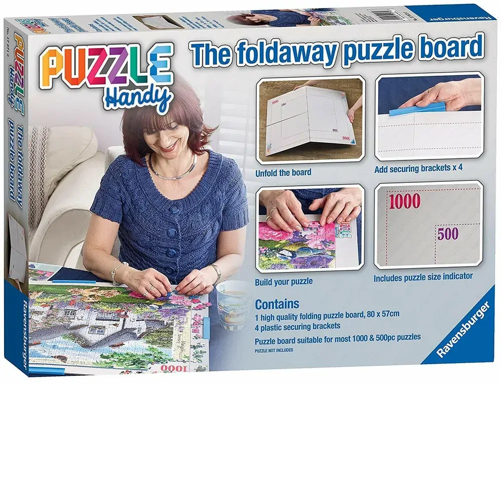 The Puzzle Handy Foldaway Puzzle Board assembly is simple: just unfold the board, add one of the plastic securing brackets on each side to make the board rigid, and start your puzzle! Printed with a neutral non-glare background colour and including dotted guidelines showing the approximate finished sizes of Ravensburger 500 and 1000 piece puzzles (49 x 36cm and 70 x 50cm respectively). Use the guidelines to help you ensure your puzzle is centrally located on the board, which can be a great help with the jigsaw-building process. When you've finished your puzzle and want to put the Puzzle Handy away, just remove the securing brackets, refold the board and pop it back into the storage box provided! Suitable for assembling most 1000 and 500 piece jigsaws.