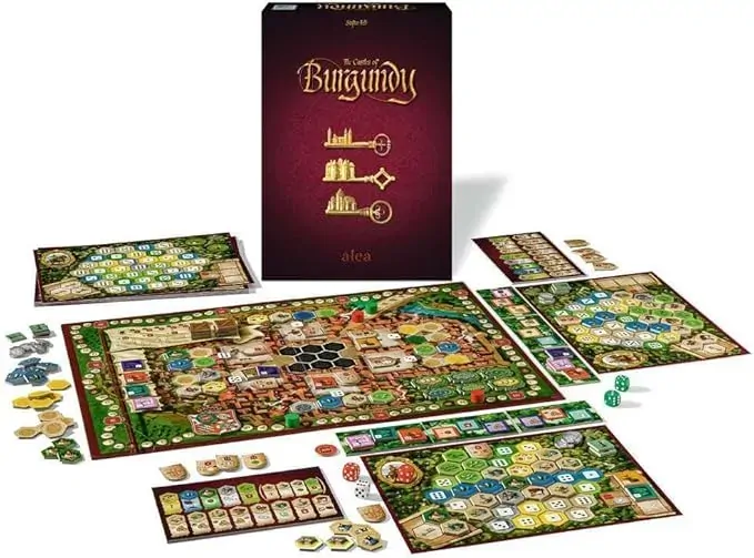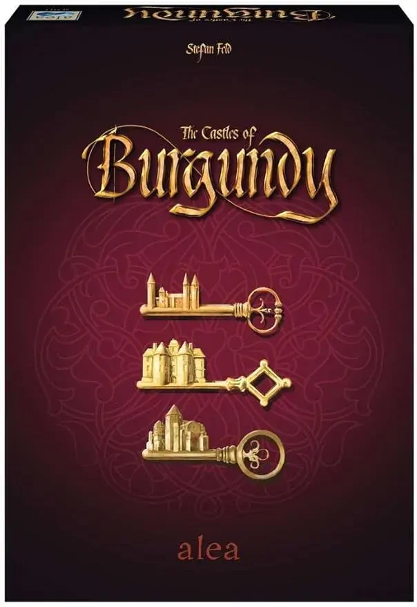 The Castles of Burgundy is set in the Burgundy region of High Medieval France. Each player takes on the role of an aristocrat, originally controlling a small princedom. While playing, they aim to build settlements and powerful castles, practice trade along the river, exploit silver mines, and use the knowledge of travelers. The game is about players taking settlement tiles from the game board and placing them into their princedom, which is represented by the player board. Every tile has a function that starts when the tile is placed in the princedom. The princedom itself consists of several regions, each of which demands its own type of settlement tile. The game is played in five phases, each consisting of five rounds. Each phase begins with the game board stocked with settlement tiles and goods tiles. At the beginning of each round, all players roll their two dice, and the player who is currently first in turn order rolls a goods placement die. A goods tile is made available on the game board according to the roll of the goods die. During each round, players take their turns in the current turn order. During their turn, a player may perform any two of the four possible types of actions: Take a settlement tile from the numbered depot on the game board corresponding to one of their dice and place it in the staging area on their player board. Place a settlement tile from the staging area of their player board to a space on their player board with a number matching one of their dice in the corresponding region for the type of tile and adjacent to a previously placed settlement tile. Deliver goods with a number matching one of their dice. Take worker tokens that allow the player to adjust the roll of their dice. In addition to these actions, a player may buy a settlement tile from the central depot on the game board and place it in the staging area on their player board. If an action triggers the awarding of victory points, those points are immediately recorded. Each settlement tile offers a benefit: additional actions, additional money, advancement on the turn order track, more goods tiles, die roll adjustment or victory points. Bonus victory points are awarded for filling a region with settlement tiles. The game ends when the last player finishes their turn of the fifth round of the fifth phase. Victory points are awarded for unused money and workers and for undelivered goods. Bonus victory points from certain settlement tiles are awarded at the end of the game. The player with the most victory points wins.