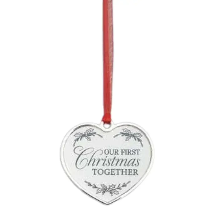An elegant keepsake for a couple's first Christmas together. This hanging ornament is heart-shaped with silver edges, 'Our First Christmas Together' written in the center and a red mesh ribbon to hang.