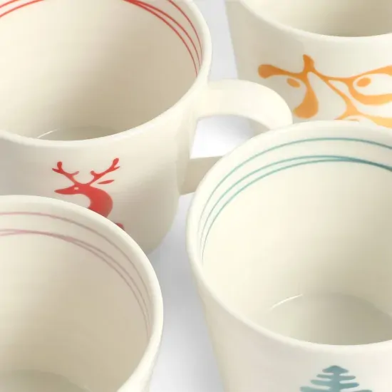 Make every festive sip special with this Set of 4 1815 Christmas Mugs. Crafted from durable porcelain, each 400ml mug features a playful stylised motif - a green Christmas tree, orange mistletoe, purple bird, and red reindeer - complete with coordinating line details inside each mug.