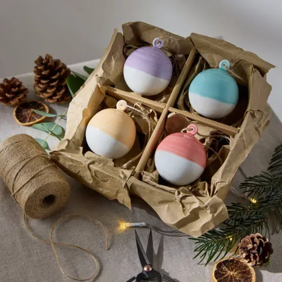- Hand-dipped glazed baubles in rich festive colours - purple, red, orange, and green