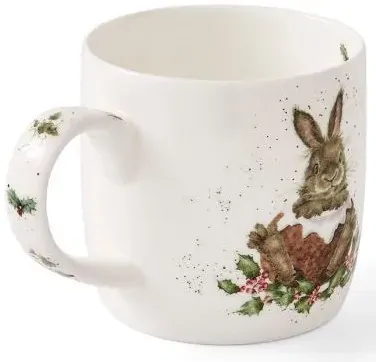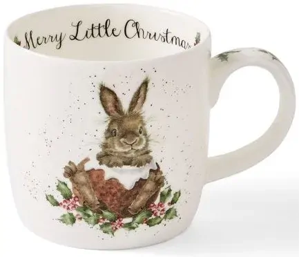 The front of the mug depicts an endearing bunny who has managed to hollow out a Christmas pudding so he can sit in it, surrounded by holly leaves and berries. His fur coat and whiskers are depicted in stunning detail and the image is surrounded by Wrendales trademark speckling design which adds an extra touch of detail and contrast. On the reverse of the mug is the same illustration and the handle is decorated with little bunches of holly. The illustration pleasingly contrasts against the crisp white background of the mug. On the inside rim of the mug is the text Merry Little Christmaswritten in a black font.