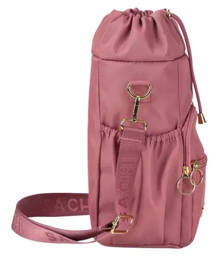 -Adjustable, removable crossbody strap featuring jacquard Sachi logo.