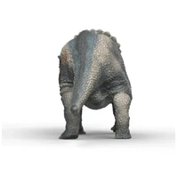 The Triceratops seems to want to eat undisturbed. With its head lowered, it plucks grass and bushy herbs its favourite food with its pointed mouth. As this herbivore weighs up to twelve tons, it has to eat quite a lot to get its fill. That takes a while! So it's no wonder that the dinosaur with the easily recognisable horns is often seen feeding in a meadow.