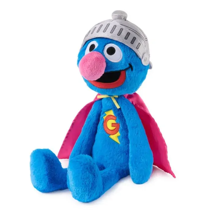 -Soft plush toy features the friendly blue Muppet dressed in his hot pink satin cape, knight's helmet, and he features an embroidered G with a lightning strike on his chest