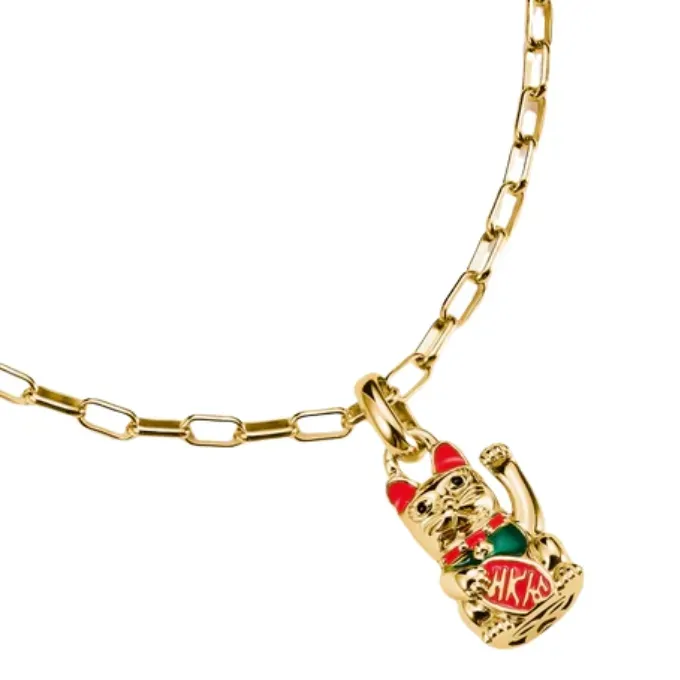 Combine the playful waving cat charm on necklaces and bracelets to suit your taste thanks to the filigree eyelet. The detailed waving cat made from recycled 925 silver is finished with high-quality 18k gold plating, hand-applied colourful enamel and fine engraving lines. Originally from Japan, the waving cat with its typical red bracelet and bell is said to attract good luck with its waving. The sign in its paw symbolises prosperity. Style your look as you wish and mix and match the charm pendant with other charms that tell your personal story!