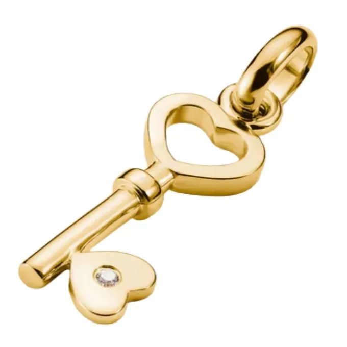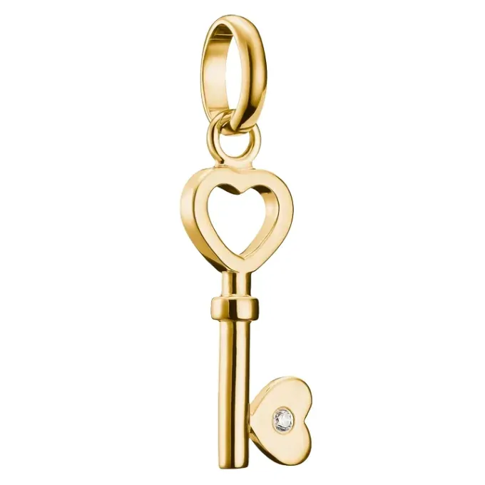 Add a romantic touch to your look with this love key charm, whose head and lower end are designed in the shape of a heart. Filigree eyelet for easy combination with necklaces and bracelets. Made from recycled 925 silver with 18k gold plating and a sparkling zirconia stone that gives the charm extra lustre. Mix & match - combine this charm with other pendants to tell your personal story and individualise your look!