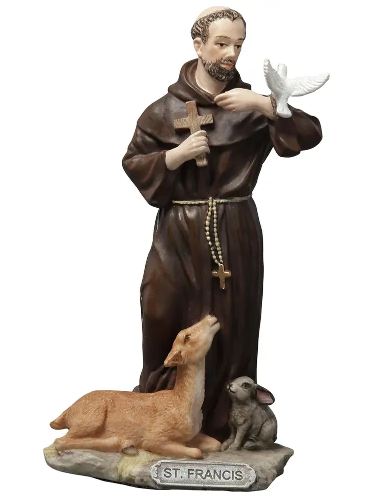This statue depicts Saint Francis. Text at the base reads: 'St. Francis'.