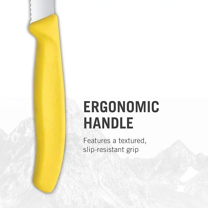 Bring colour and function to the table with our tidy Swiss Classic Tomato and Table Knife. Each of the six pieces in this set of table knives has an ultra-sharp wavy edge designed for smoothly cutting through steak and pizza. And with it's ergonomic handle and perfect size, you might even use it to cut everything else in the kitchen as well. Functional in purpose, but with a twist of fun in their juicy colourway of light green, blue, red, yellow, pink and orange, this set lifts the mood in any kitchen and at any table.